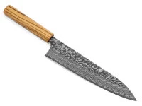 ausgestattet. Der Klingen-Kern besteht aus VG-10 Stahl, der mit insgesamt 34 Lagen Damast Stahl ummantelt ist. Dabei setzt Yoshimi Kato zwei unterschiedliche Sorten von Damast Stahl ein, um das optimale Härte-Flexibilität Verhältnis zu erreichen. Das ungewöhnliche Hammering der Klinge im oberen Teil ist nicht nur ein auffallendes Design-Merkmal, es hat bei Tests auch sehr gute Anti-Haft Effekte gezeigt. Die Form