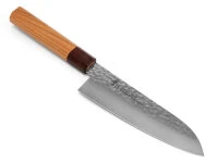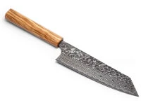 Material: Die Kochmesser Serie Damaskus baut Yoshimi Kato aus VG-10 Stahl auf. VG-10 ist ein japanischer Hochleistungsstahl, der sich besonders durch hohe Härte, sehr gute Flexibilität und seine Korrosionsbeständigkeit auszeichnet. Die Verschleißbeständigkeit und die Beständigkeit der Schärfe dieser Kochmesse sind hervorragend, der Stahl lässt sich leicht schärfen. Der