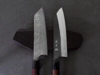 Japanische Kochmesser bestehen aus äußerst harten Stählen und sind dünner geschmiedet und geschliffen als ihre europäischen Pendants. Einige dieser Messer verfügen über sehr fein geschliffene Schneidlagen, wodurch sie empfindlicher sind und sich lediglich für weiches Schnittgut eignen. Bitte beachten Sie diesbezügliche Informationen in den Produktdetails. Insbesondere Messer mit sehr dünner Schneide und Hohlschliff neigen zu Ausbrüchen an der Klinge. Diese sind hervorragend für feine Schnitte von weichem Schnittgut geeignet, sind aber mit entsprechender Vorsicht zu verwenden. Beim Schärfen auf einem Schleifstein entsteht in der Regel ein Winkelschliff, wodurch die Schneide mit der Zeit stabiler wird.