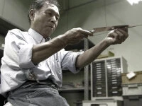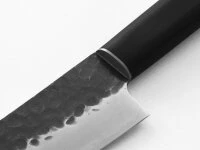 verträgt auch leichte Hackarbeiten, ist sehr handlich und wird meist sehr scharf geschliffen (Schleifstein 3000 oder mehr). Sehr gut passt das Hammerschlag Finish zu dieser Messerform und die spezielle Art, wie die Klinge in den Griff eingearbeitet ist. Die Außenhaut der Klinge – Yamato Messer sind Damastmesser mit 3 Lagen – ist aus rostfreiem Edelstahl, der Klingenkern aus hartem Karbonstahl.